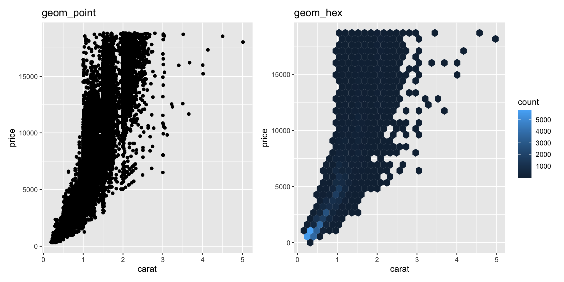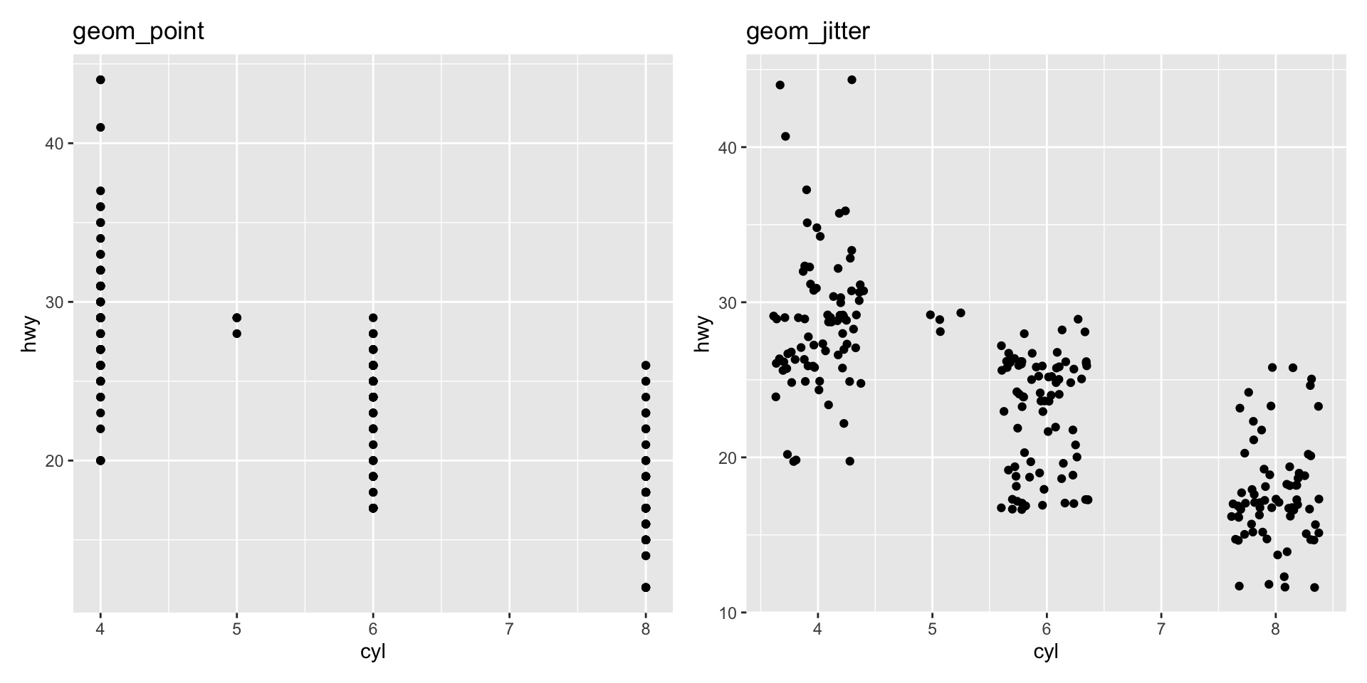 geom_jittergeom_hexJitter: add a bit of random noise so points don’t step on each other