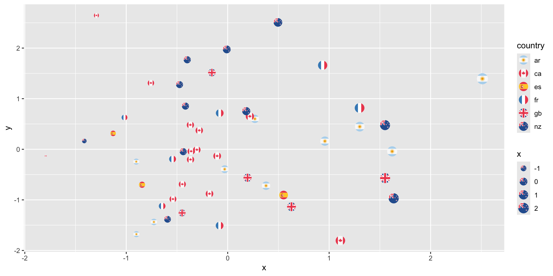 ggplotSee the ggimage or ggflags package for images as “points”:
