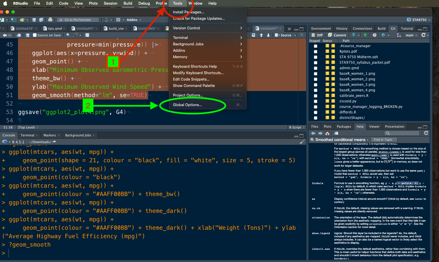 Global Options >> Toolsmenu is available at the same place you’ll find options for almost all Mac software: along the very top bar of the screen when you are in the relevant app. If you don’t see this bar, you need to exit full screen mode. Note that this is a Mac-wide way of displaying and hiding menus, and is not specific toRStudio. On a Windows machine, the tools are usually located near the top of the RStudio window, not near the top of the entire display. If you are interested in bioinformatics, the Bioconductor project develops incredible open-source