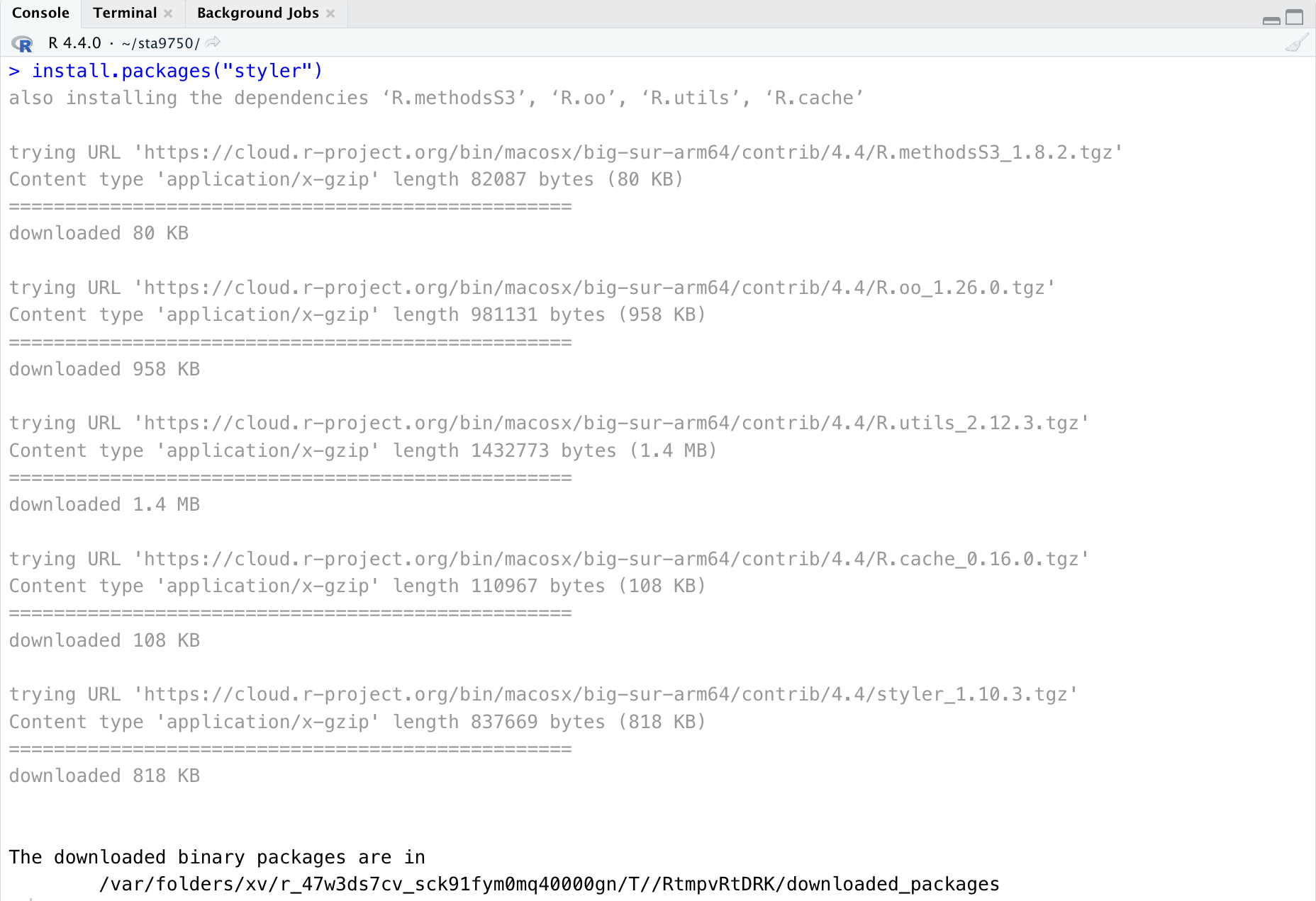 We will use the contributed styler package to format code in this course. Run the following command to automatically download and install the styler package: