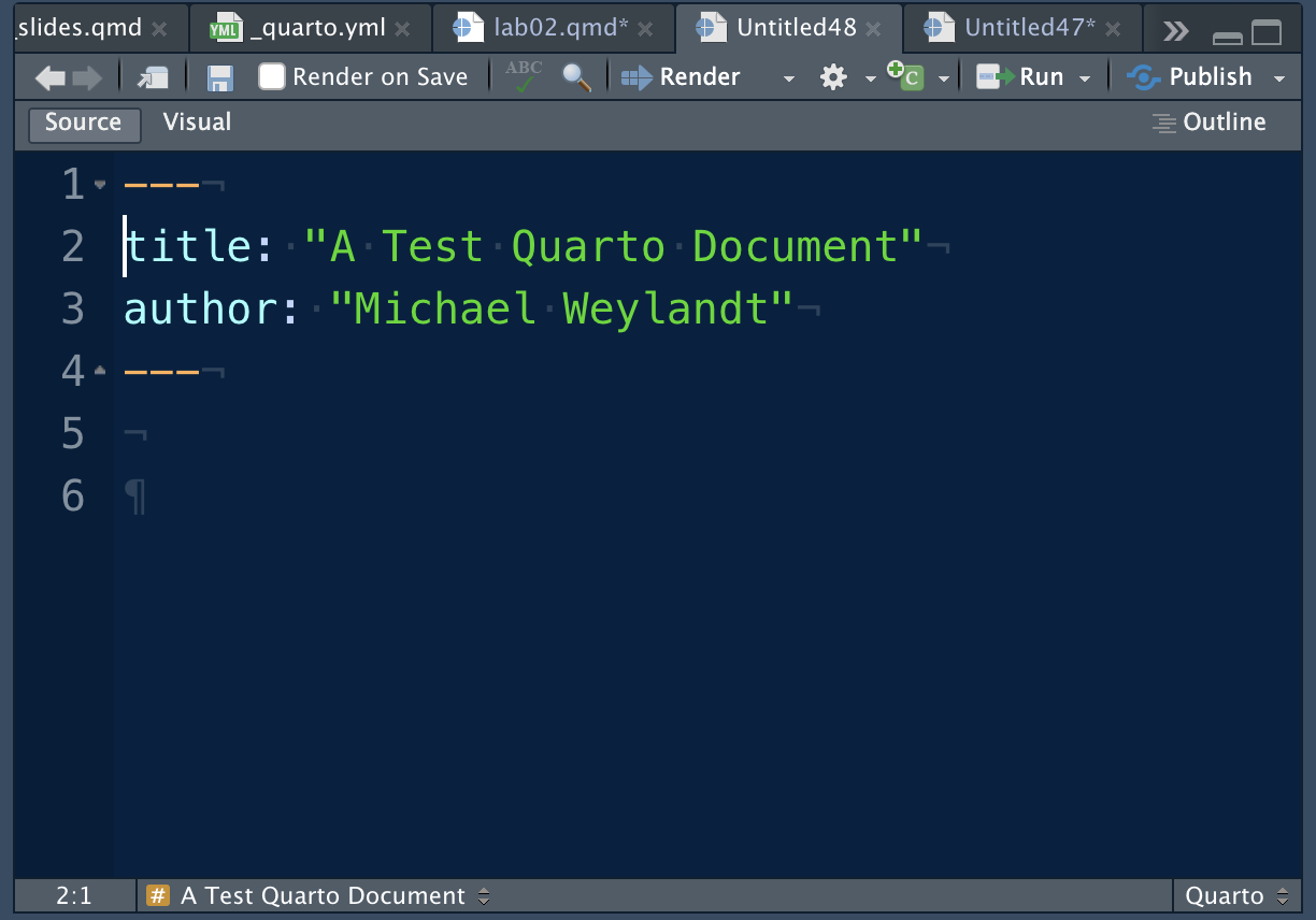 The area of the qmd document at the top between the --- bars is the document header. This isn’t rendered in the document per se, but is used to set important settings. By default, qmd documents are rendered to HTML, but we can change this by adjusting the document header.