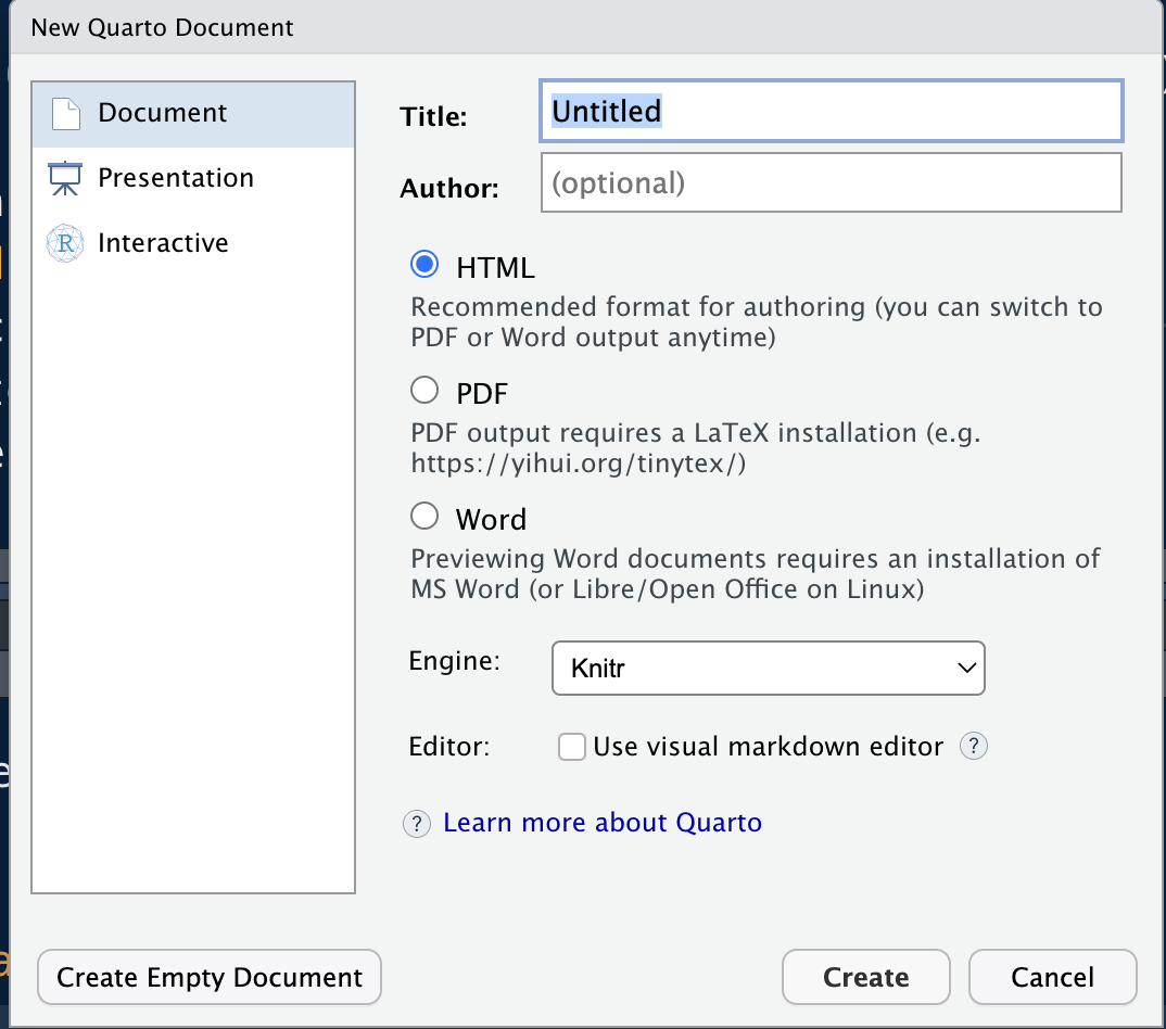 Once Quarto is installed, you can check that it is running properly by generating a new qmd document and confirming that it renders properly. To generate a qmd document, click the New File button (white page with a green + symbol) in the top right corner of RStudio and select “Quarto Document”. This will generate a wizard like this: