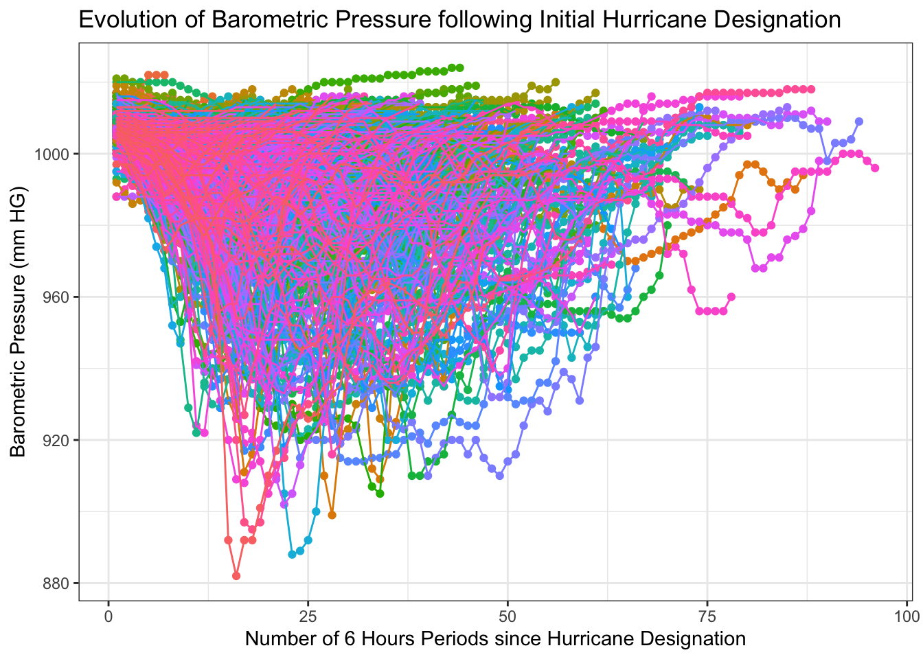 ggtitle("Evolution of Barometric Pressure following Initial Hurricane Designation")