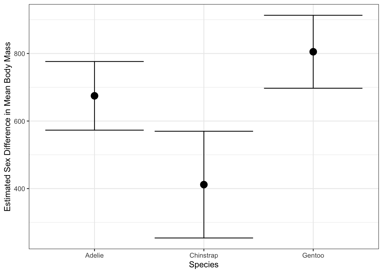Here, we see that Gentoos, being the largest penguins in our data, exhibit the largest sex difference. This pattern can be very useful for testing sub-group differences, though you should take at least a bit of care to avoid issues with multiplicity corrections: