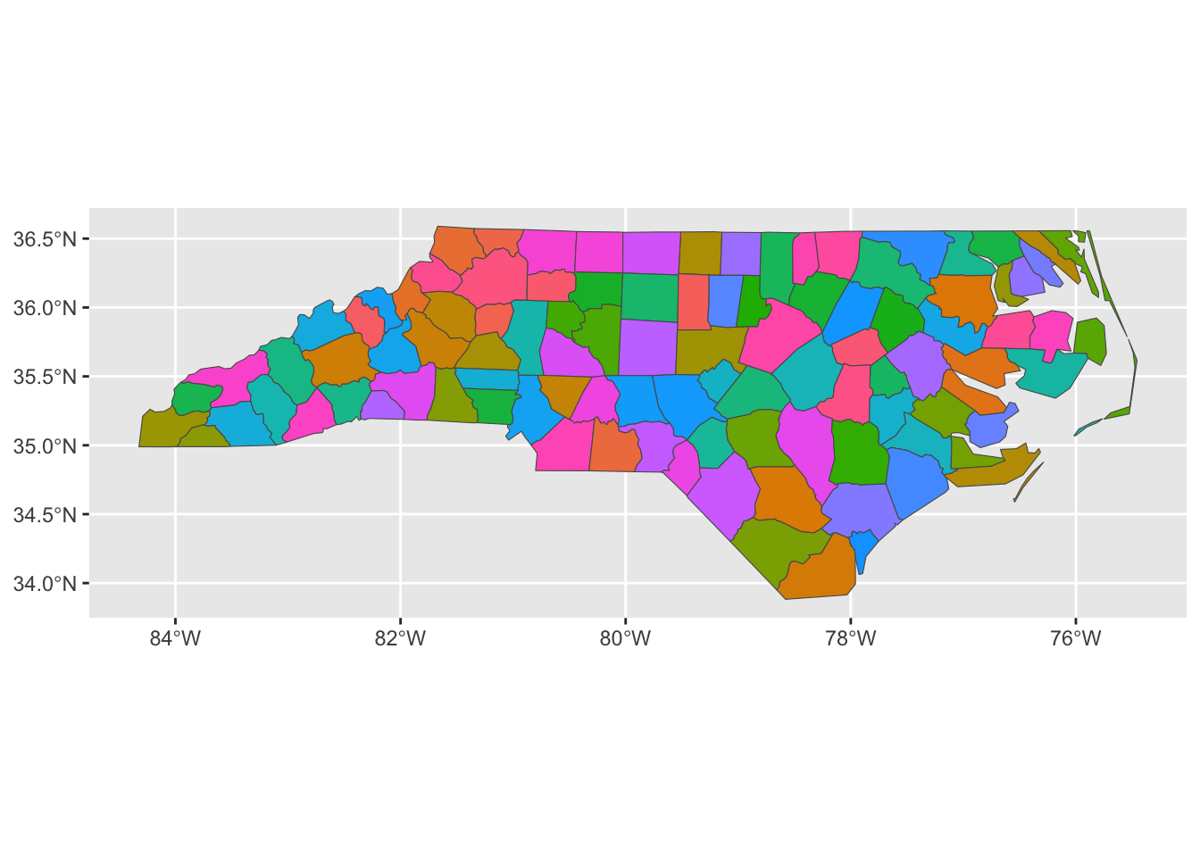This should produce a multi-colored map of North Carolina.