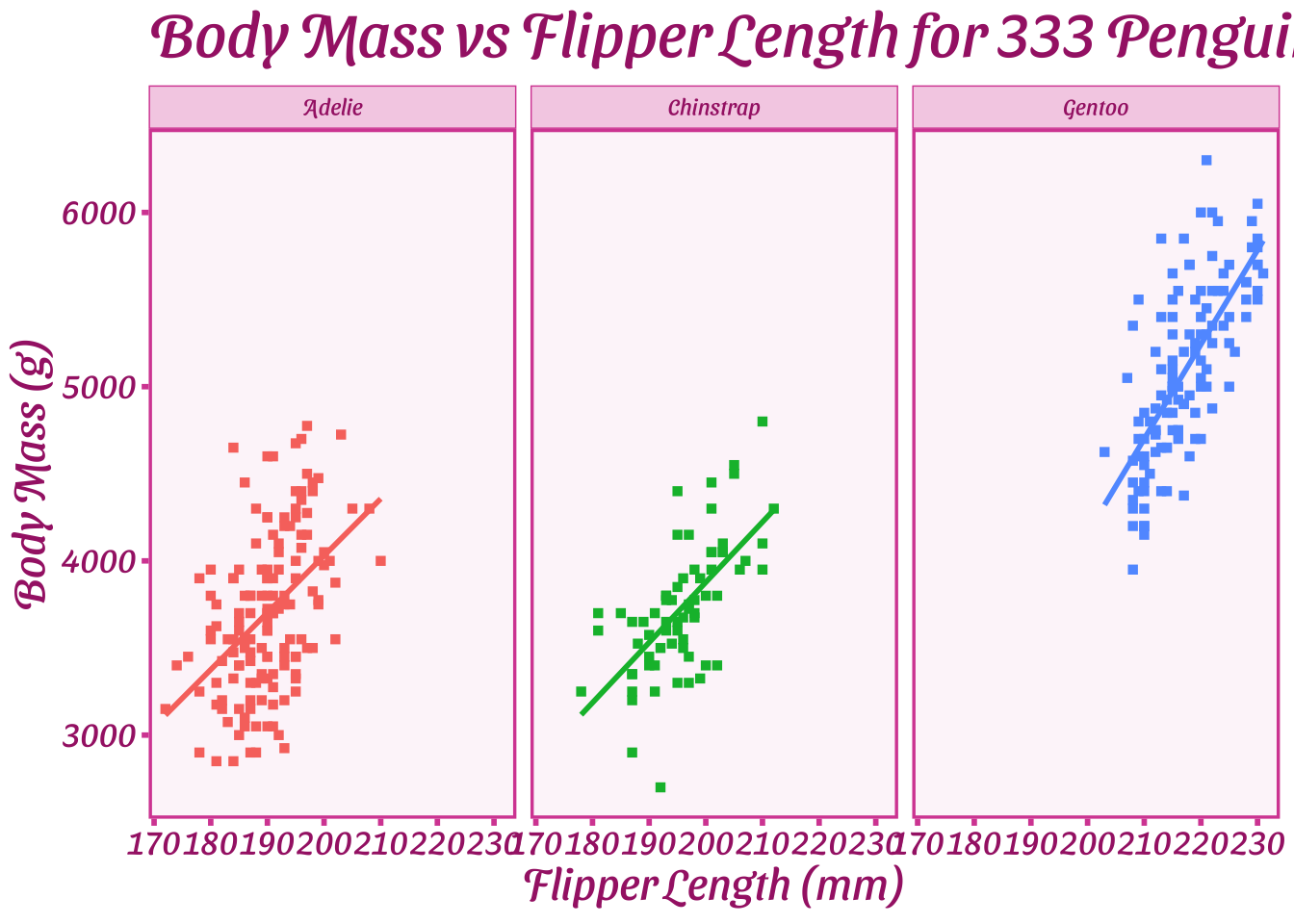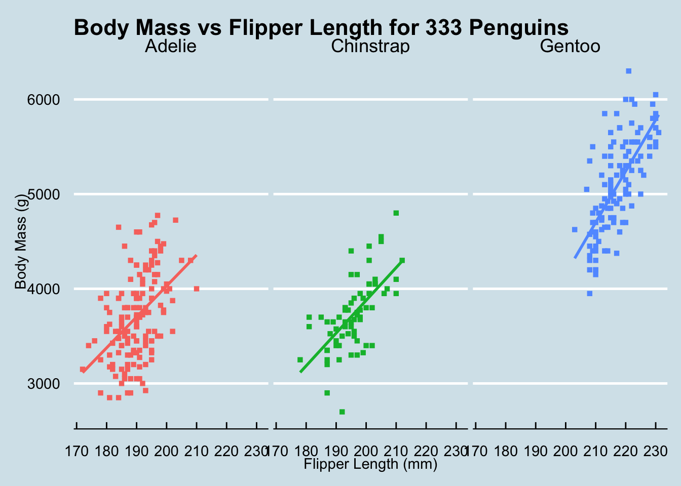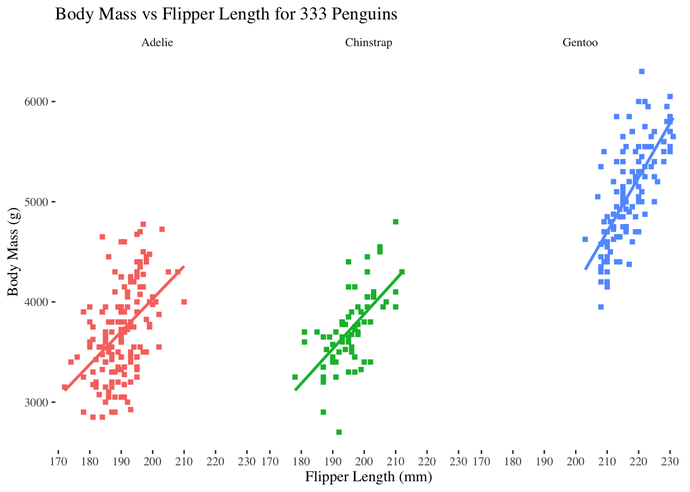 ggtitle ("Body Mass vs Flipper Length for 333 Penguins" )