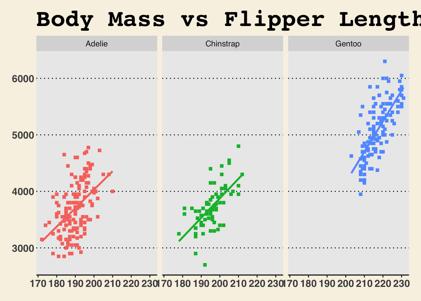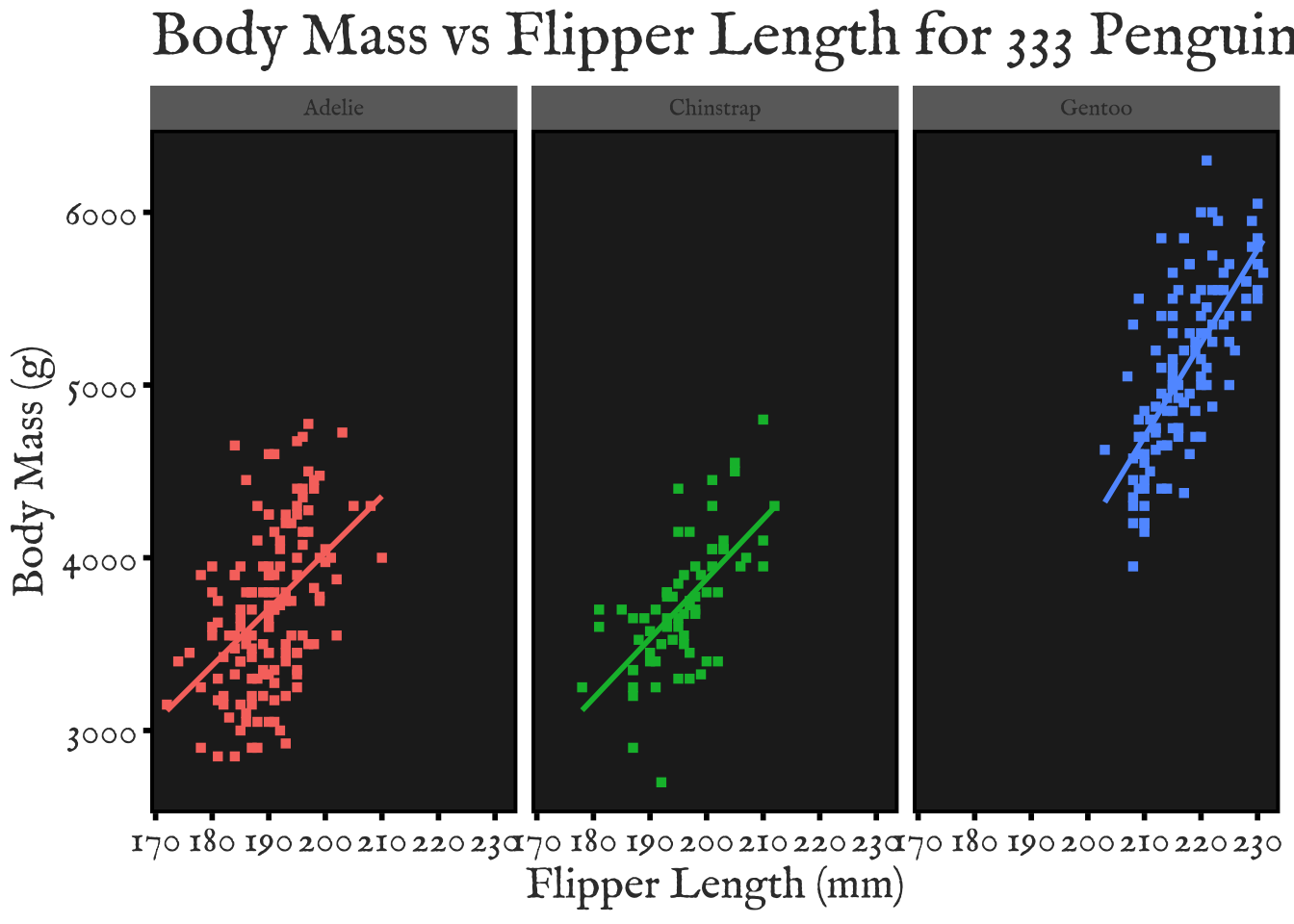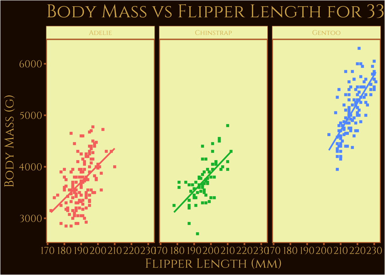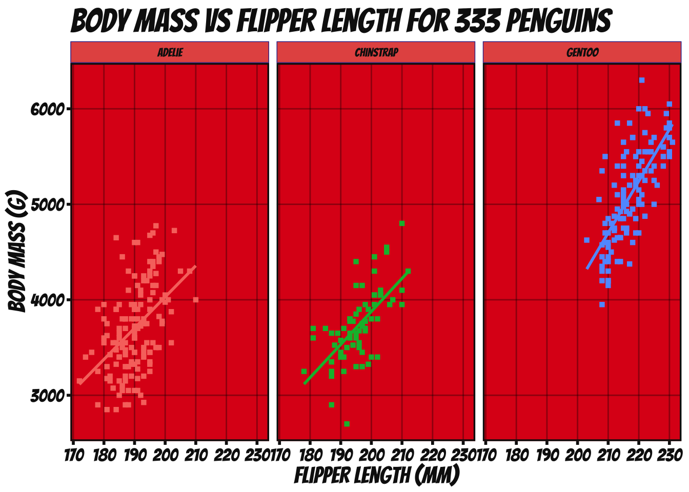 ggtitle ("Body Mass vs Flipper Length for 333 Penguins" )