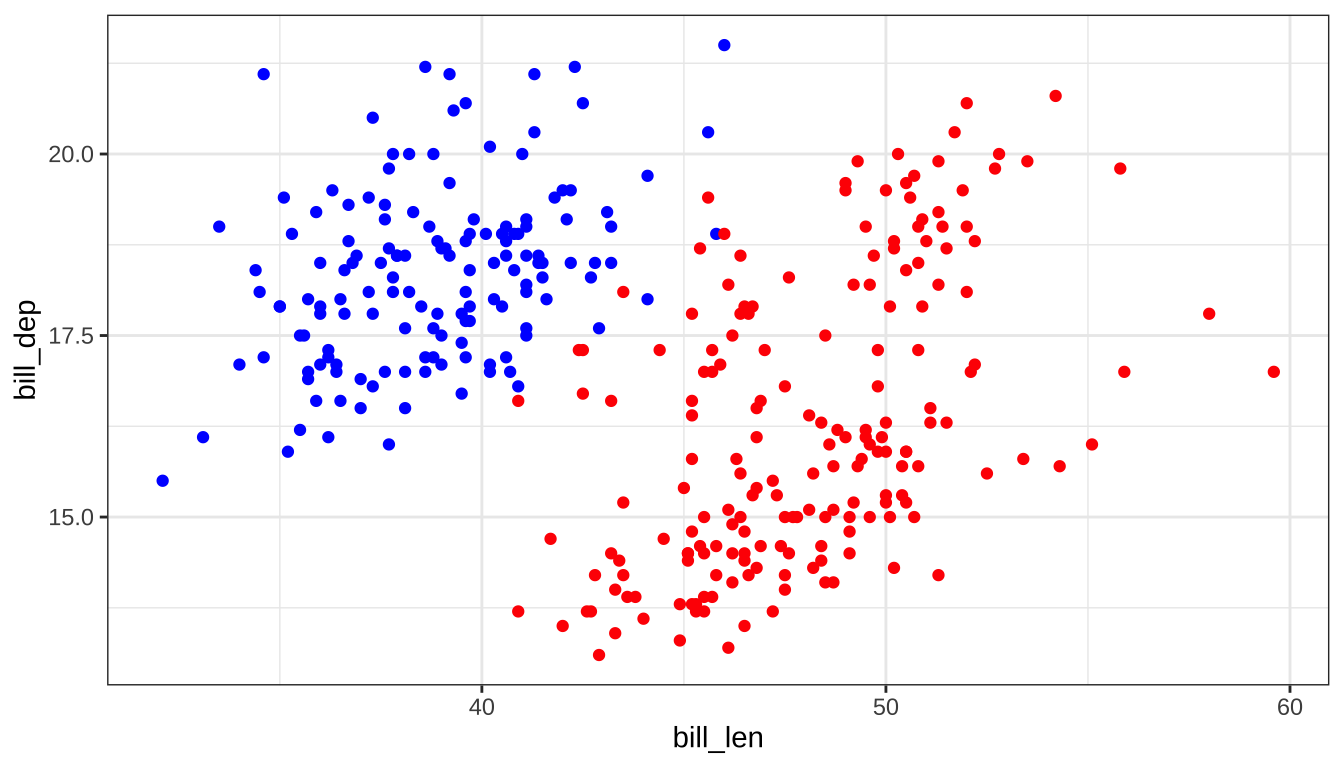 aes (x= bill_len, y= bill_dep))+ geom_point (color= "blue" )