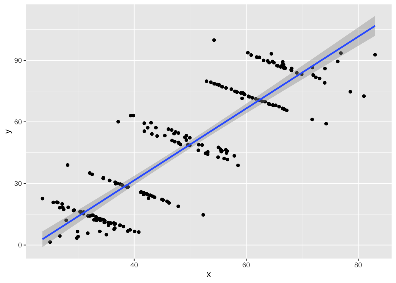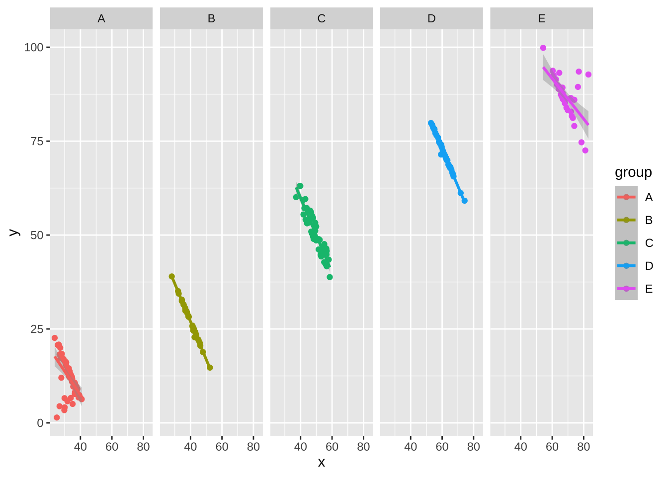 geom_point () + stat_smooth (method= "lm" ) + facet_grid (~ group)