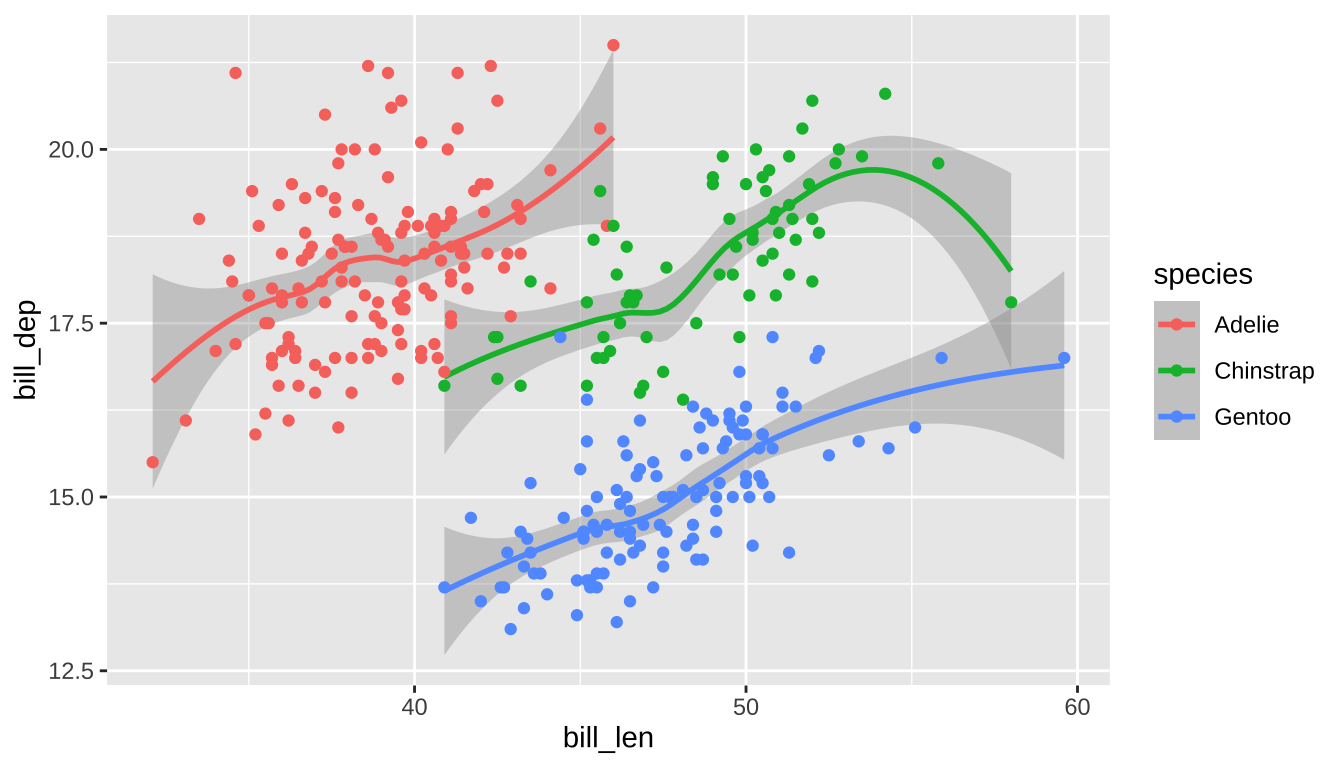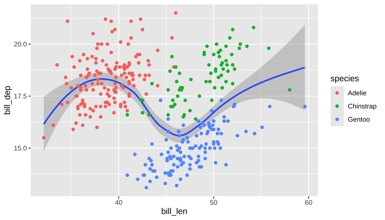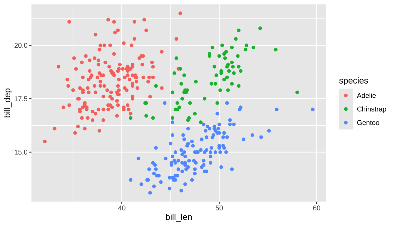 aes (x= bill_len, y= bill_dep, color= species)) +