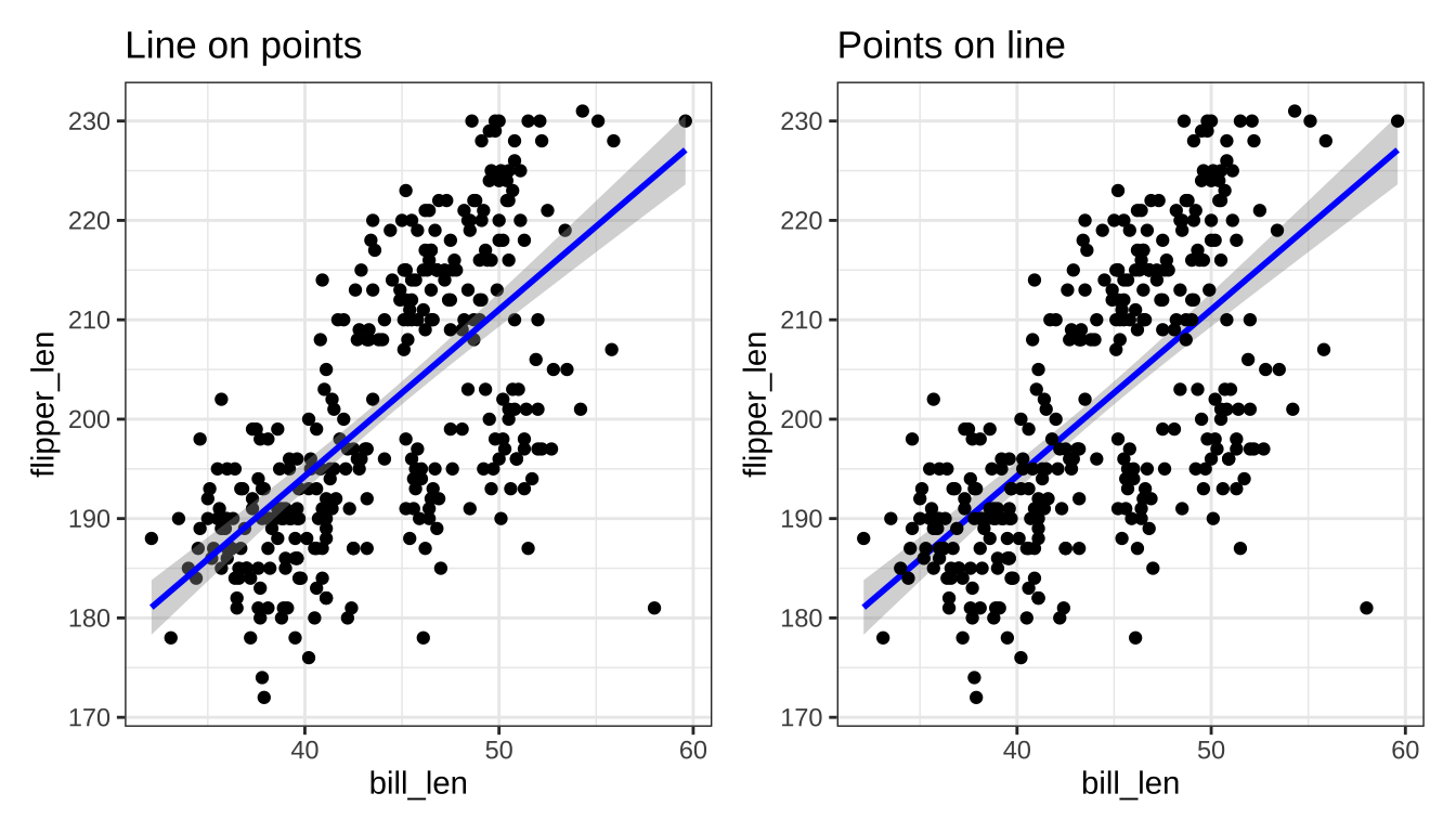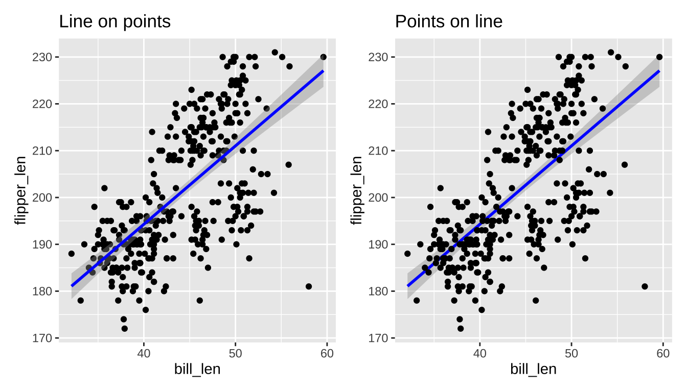 stat_smooth (color= "blue" , method= "lm" ) + ggtitle ("Line on points" )