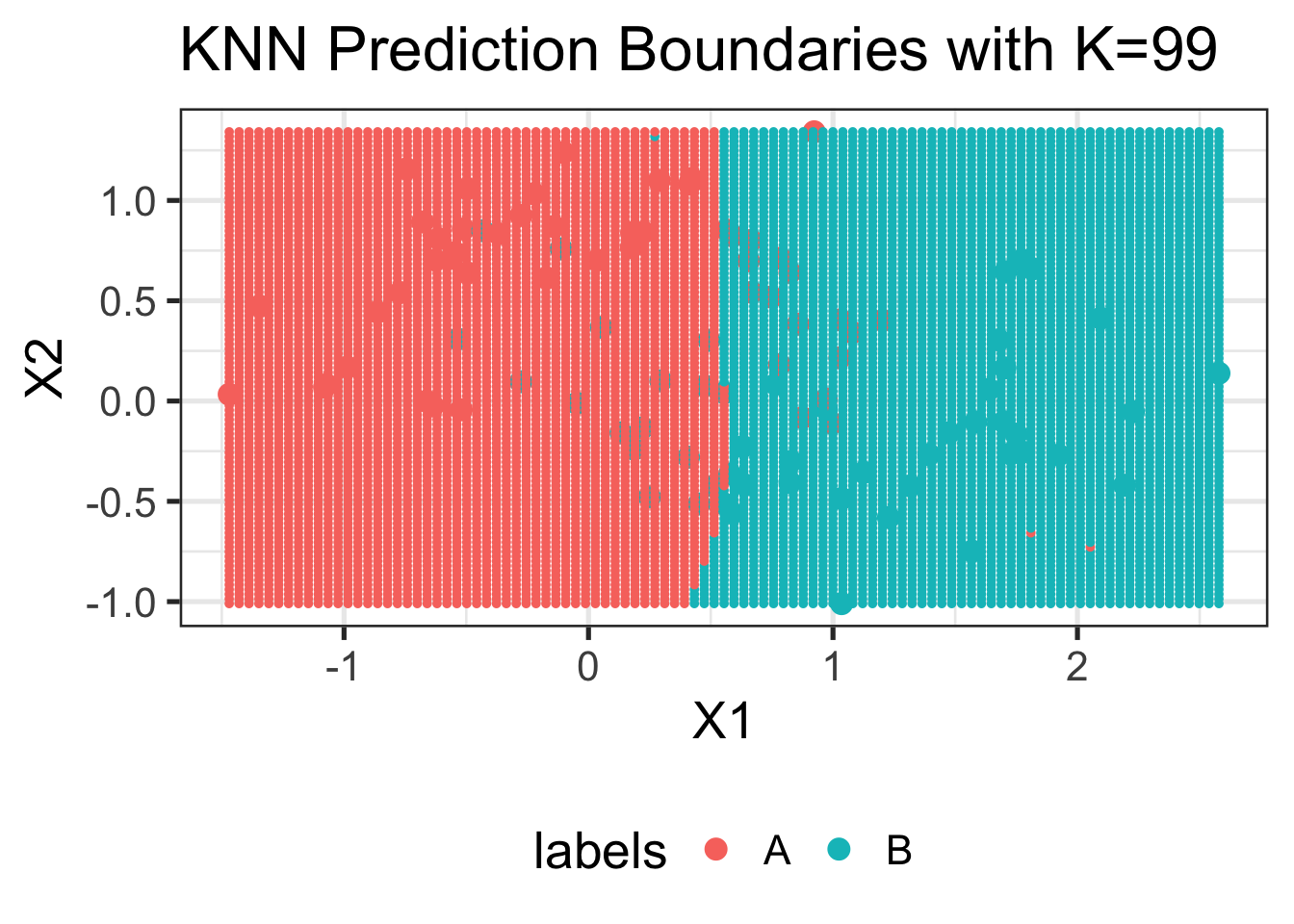 Let’s now see how complexity plays out for a very simple classifier, \(K\)-Nearest Neighbors (KNN). KNN formalizes the intuition of “similar inputs -> similar outputs.” KNN looks at the \(K\) most similar points in its training data (“nearest neighbors” if you were to plot the data) and takes the average label to make its prediction.6