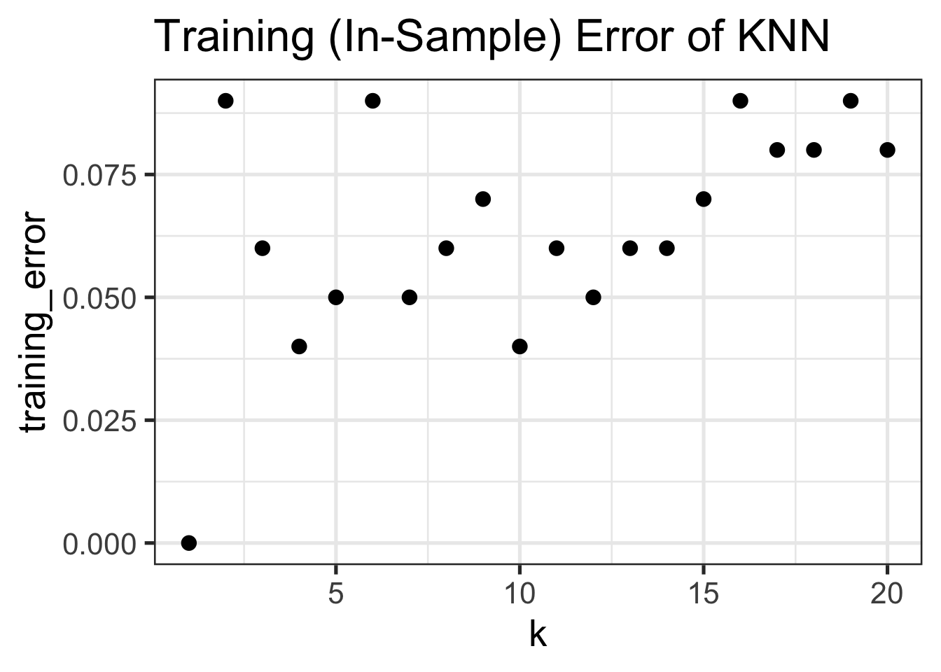 cat(paste0("At k = ", k, ", the training (in-sample) error of KNN is ", round(100 * err, 2), "%\n"))