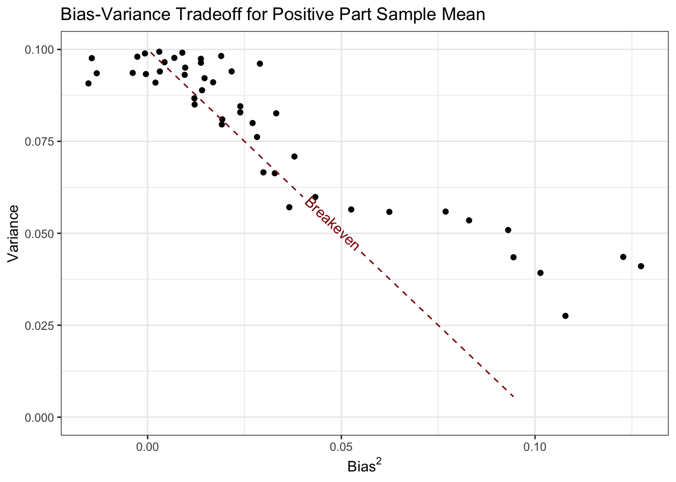 ggtitle("Non-Constant Variance of Positive Part Mean Estimator") +