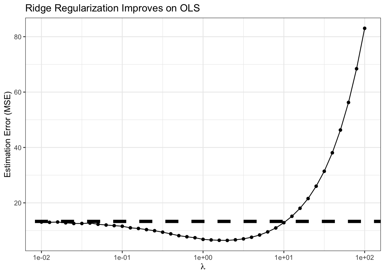 While this isn’t as simple to analyze as some of the expressions we considered above, this looks similar enough to our ‘shrunk’ mean estimator that it’s plausible it will improve on OLS. In fact, you will show in Report #01 that there is always some value of \(\lambda\) that guarantees improvement over OLS.
