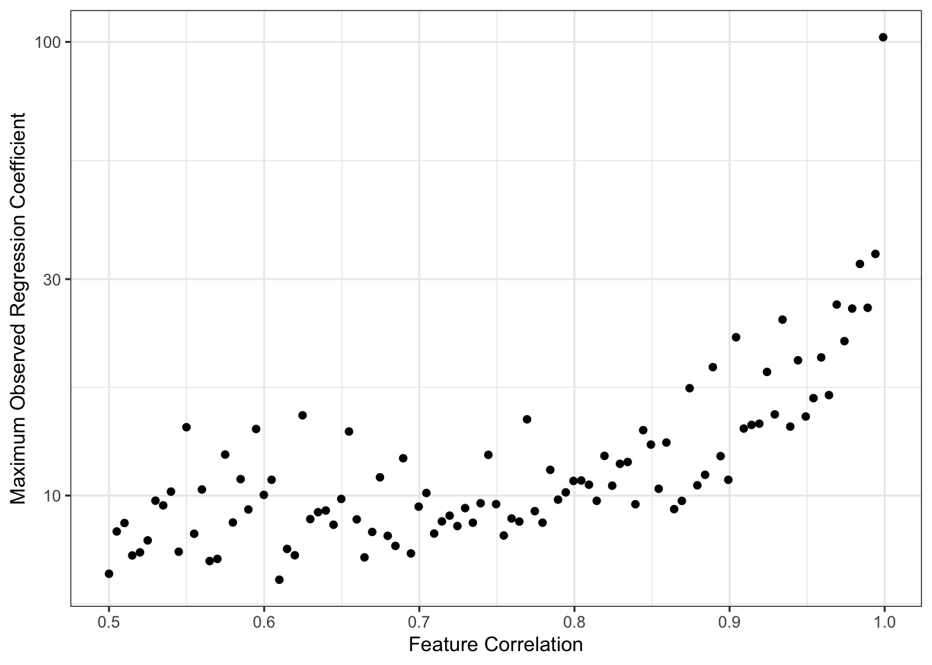 A common cause of overly large regression coefficients is correlation among the columns of \(\bX\). For example,