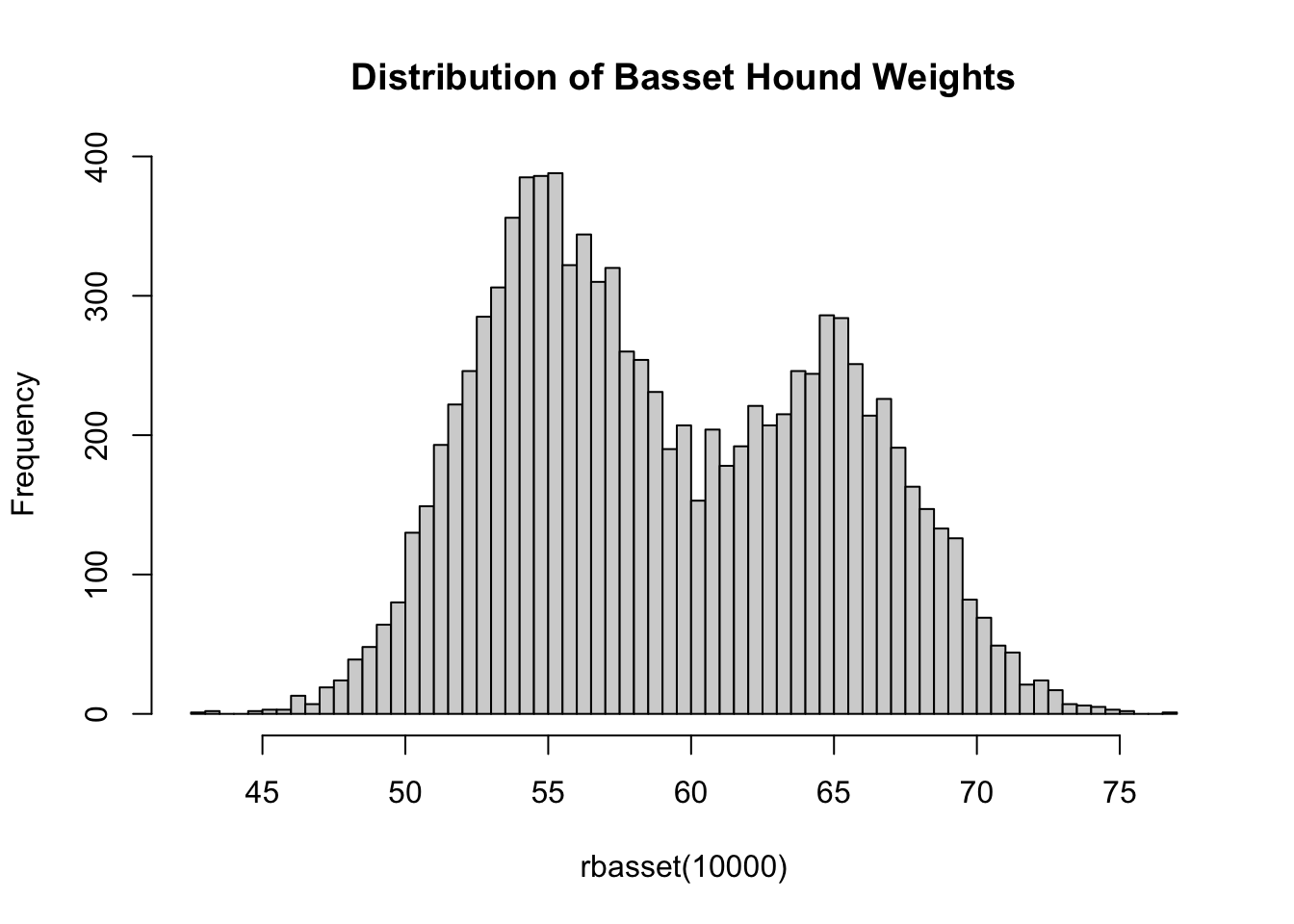Let’s look at a concrete version of this: suppose we have a population of male and female basset hounds that is 60% female. The weight of male basset hounds follows a \(\mathcal{N}(65, 10)\) distribution while females have weight distributed as \(\mathcal{N}(55, 10)\). The weight of a randomly selected basset can be sampled as