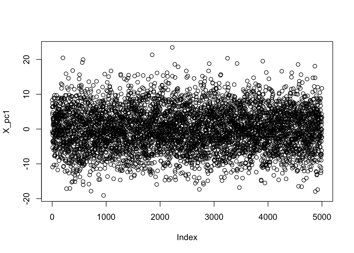 layout(title="Original 3D Data Set")Here, we have generated \(n=5000\) points in \(\R^3\). Because our feature are not uncorrelated, the resulting point cloud is not quite spherical. If we perform PCA on this data, the one dimensional projection of our results is rather uninteresting: