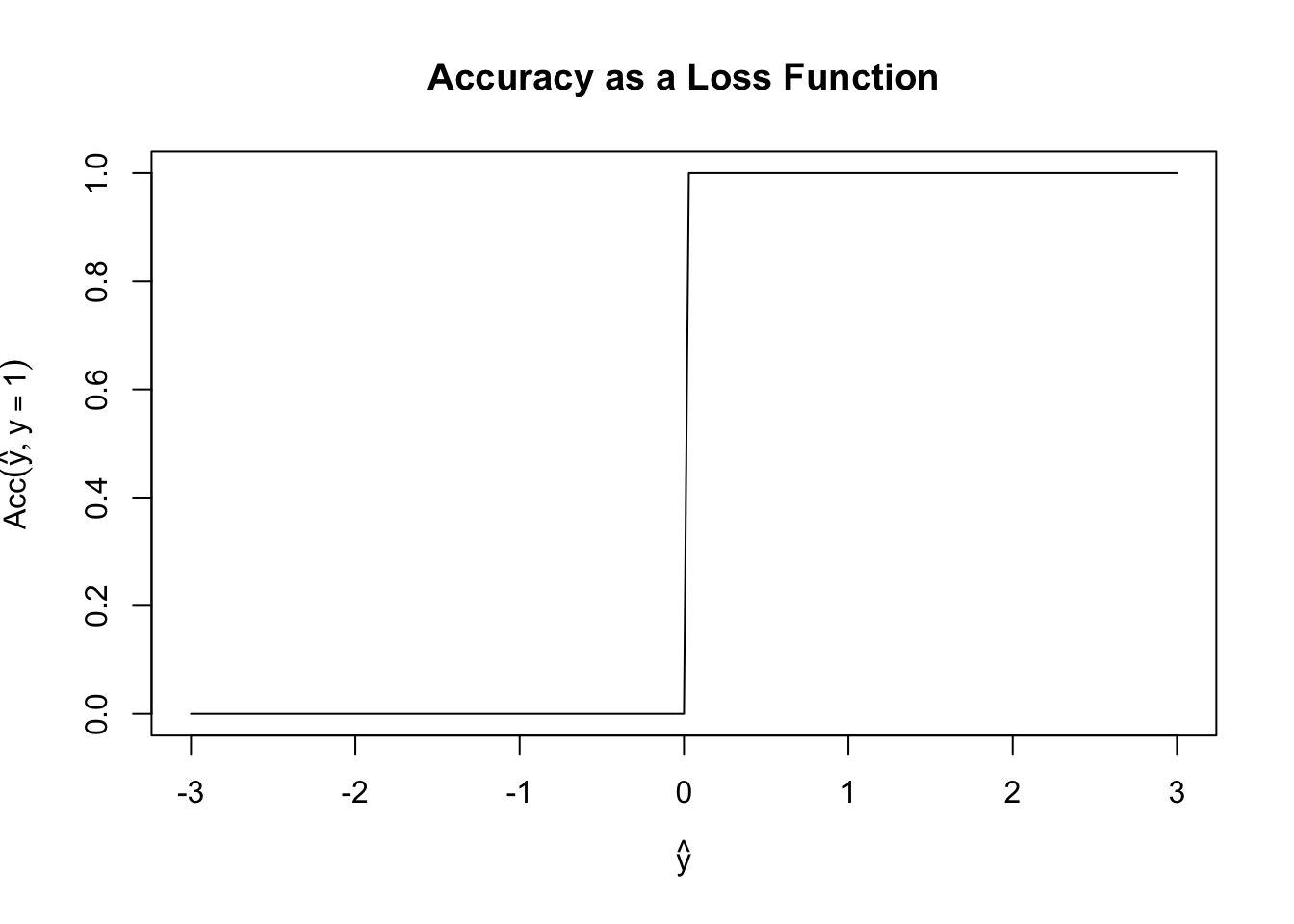 This is a terrible loss function! It is both non-convex (can you see why?) and just generally unhelpful. Because it is flat almost everywhere, we have no access to gradient information (useful for fitting) or to any sense of ‘sensitivity’ to our loss. In this scenario, if \(y=1\), both \(\hat{y}=0.00001\) and \(\hat{y}=0.9999\) have the same accuracy even though the latter is a more ‘confident’ prediction.