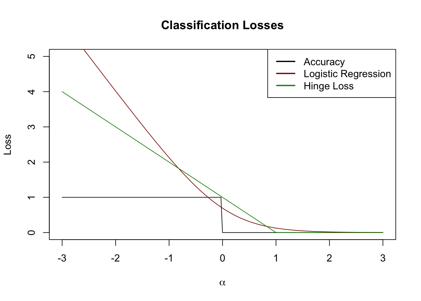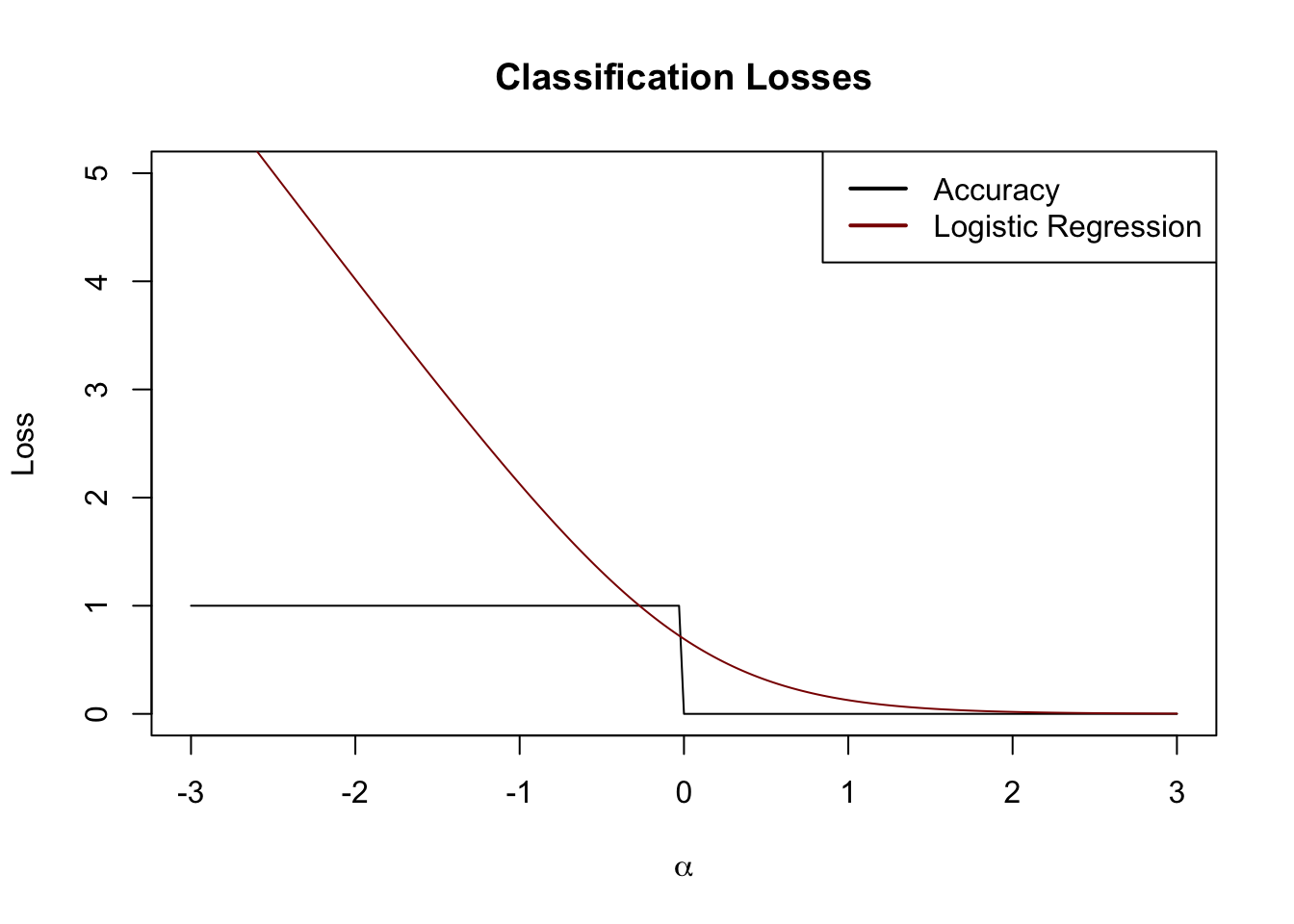 Before we build our actual first loss, it is worth asking why we can’t use something like classification accuracy as our loss function. Specifically, define \[\text{Acc}(y, \hat{y}) = \begin{cases} 1 & y = \text{sign}(\hat{y}) \\ 0 & y \neq \text{sign}(\hat{y}) \end{cases}\] Here we consider the case where \(\hat{y}\) may be real-valued as a (slight) generalization of probabilistic classification and we use the \(\pm 1\) convention for the two classes.
