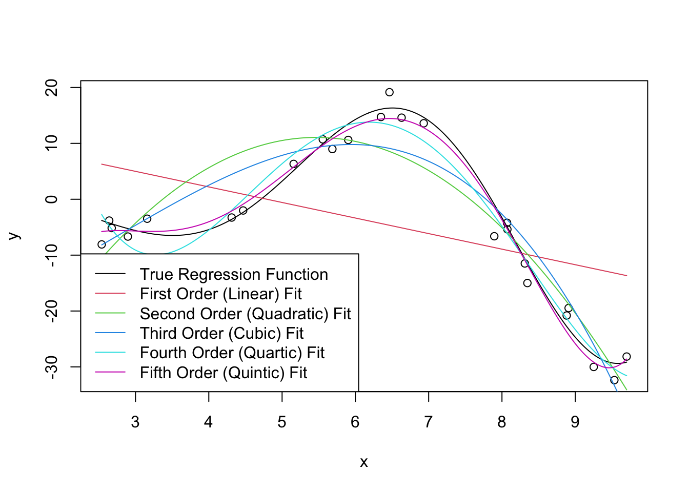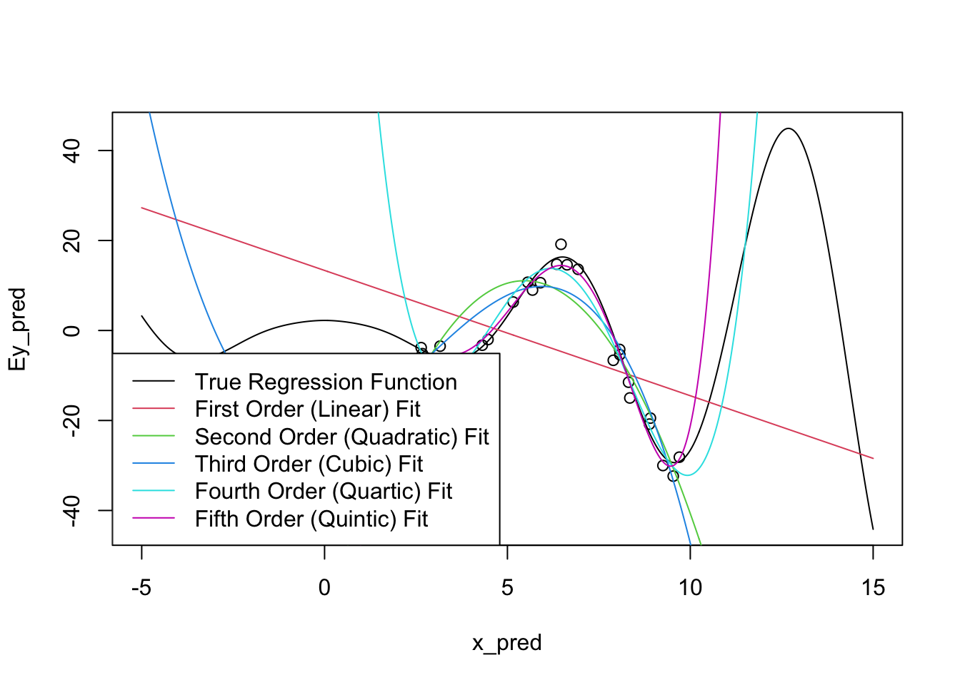 In other classes, you may have been taught that polynomial regression is a linear model. It is definitely linear in the sense that that class would have used (linear in \(\by\)) but we’re using a different sense here. The core insight of that analysis - that a non-linear function can be expressed as a linear combination of non-linear parts - will appear several times in these notes.↩︎