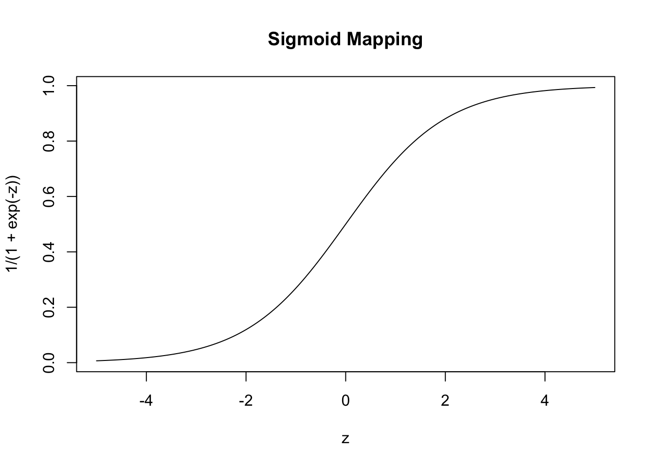The most common choice is \[\mu(z) = \frac{e^z}{1+e^z} = \frac{1}{1+e^{-z}}\], which is known as the logistic or sigmoid function due to its ‘s-like’ shape: