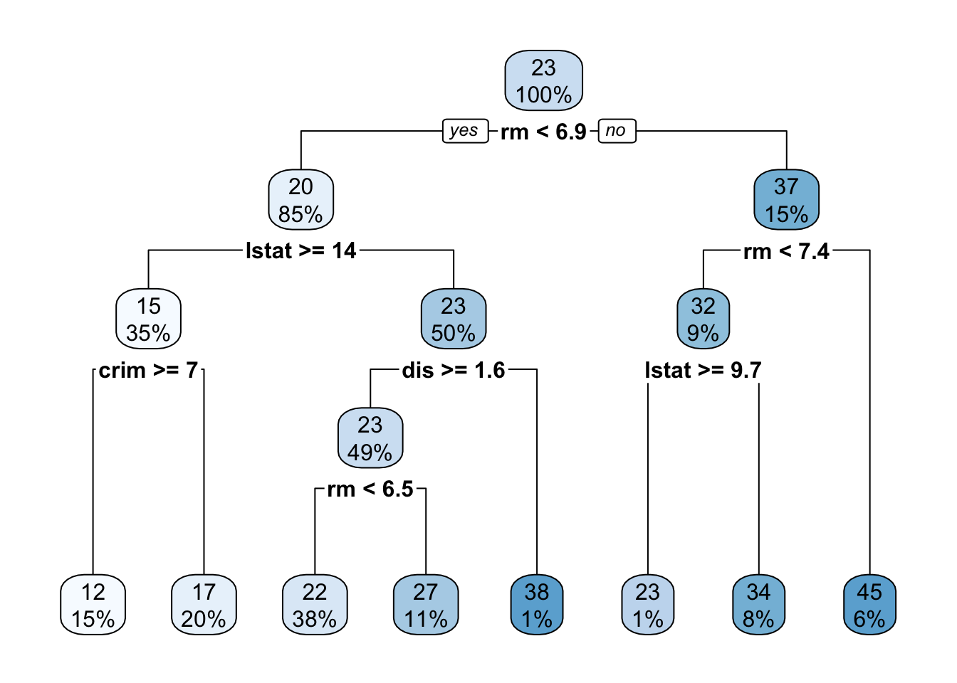 Because the later splits are computed on different data sets, they almost always select different variables at each level (as in our example above, where the two ‘level two’ splits use the lstat and rm variables). Predictions are made by taking the average (or majority) of data left in that split.