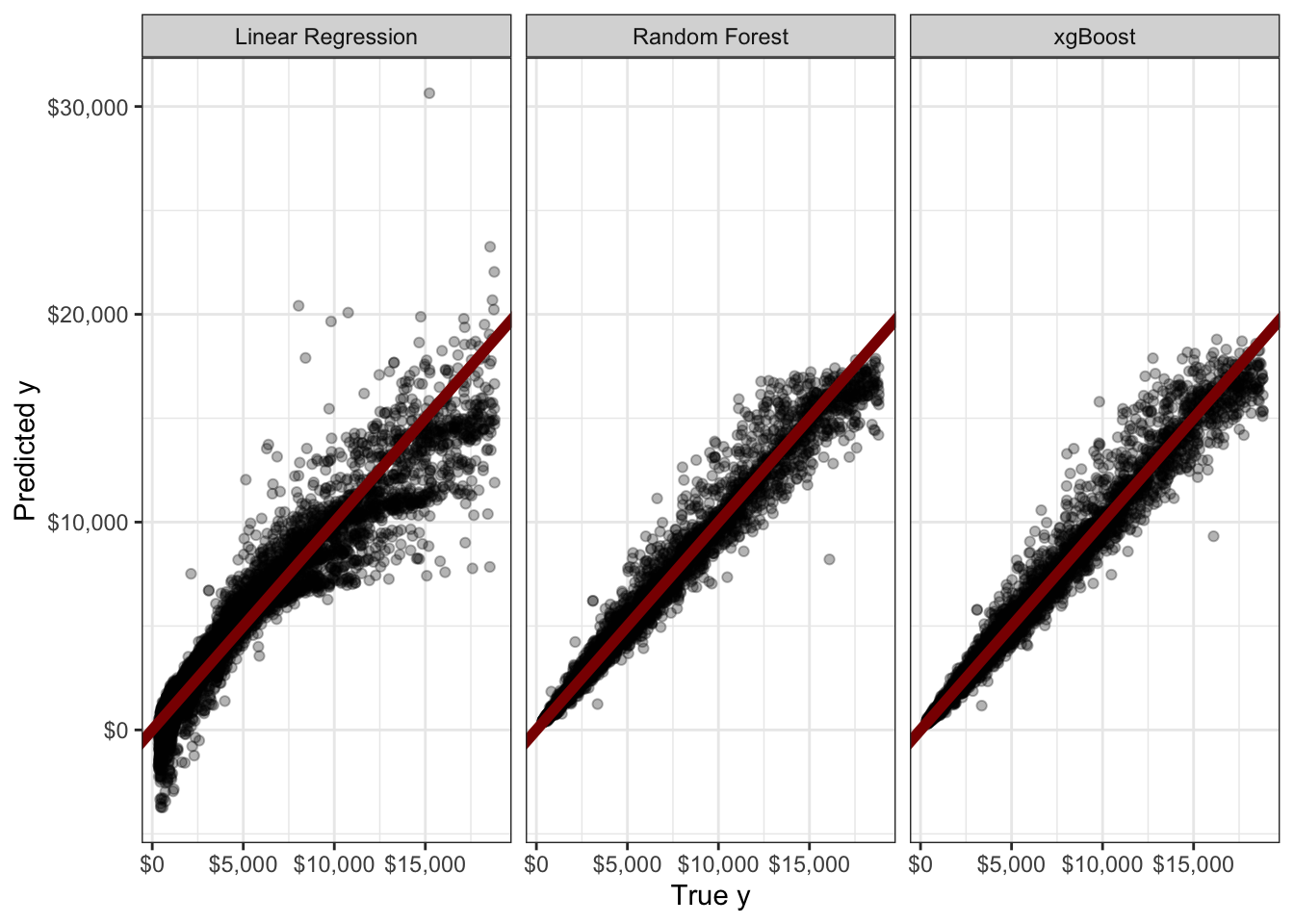 This is quite clunky - and we didn’t even do any tuning. Still, we see that a naive application of random forest (RMSE $540.39) or xgboost (RMSE $540.29) gives a real improvement over a linear model (RMSE $1119.85). For a more fluid UX, I recommend the use of the tidymodels package instead.