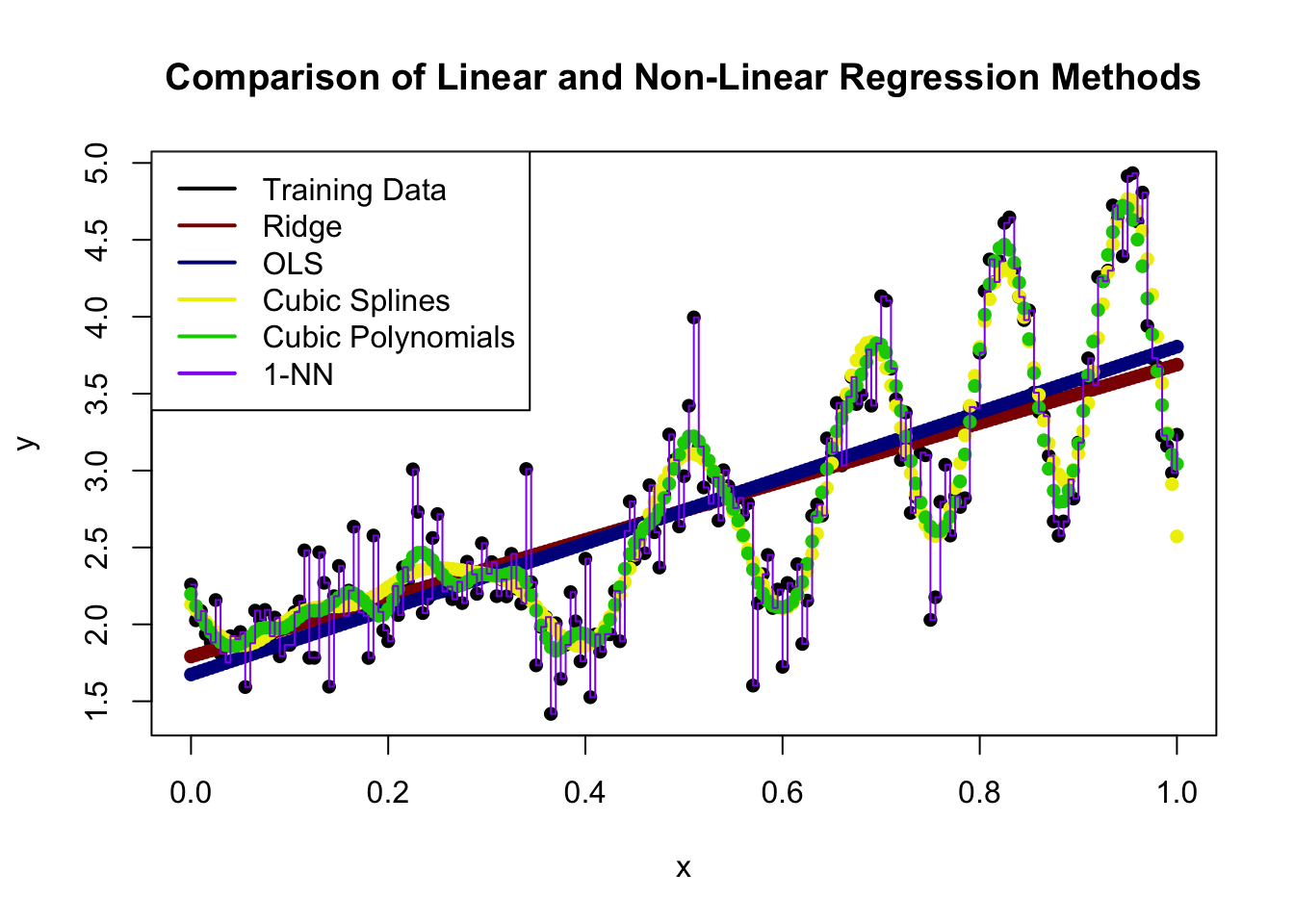 Ridge < OLS < Cubic Spline < Cubic Polynomials < 1-NN